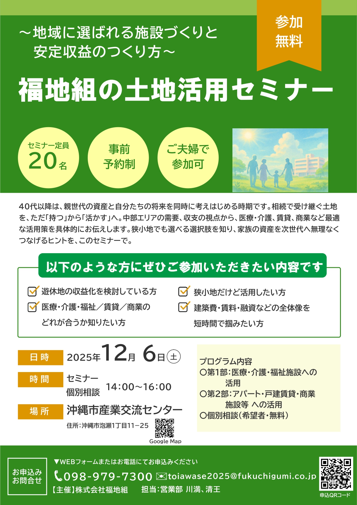 2025年12月6日(土)に土地活用セミナーを沖縄市産業交流センターで実施します。この機会に是非ともご参加ください。