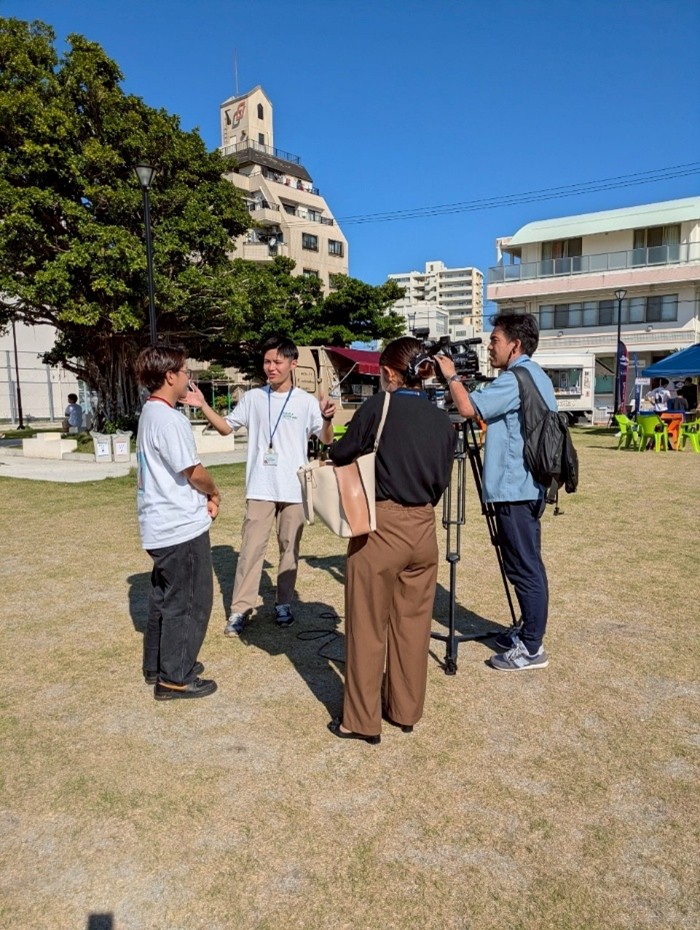 (テレビ取材を受けている與那覇さんと私、喜屋武)